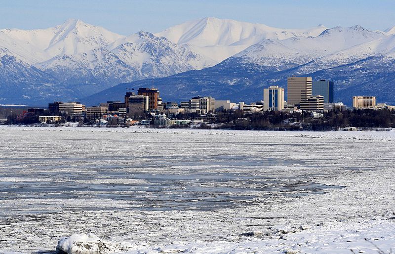 (Anchorage et les Chugach Mountains, photo de Frank K; from Anchorage, 06/04/2009, www.flickr.com,, wikipedia)